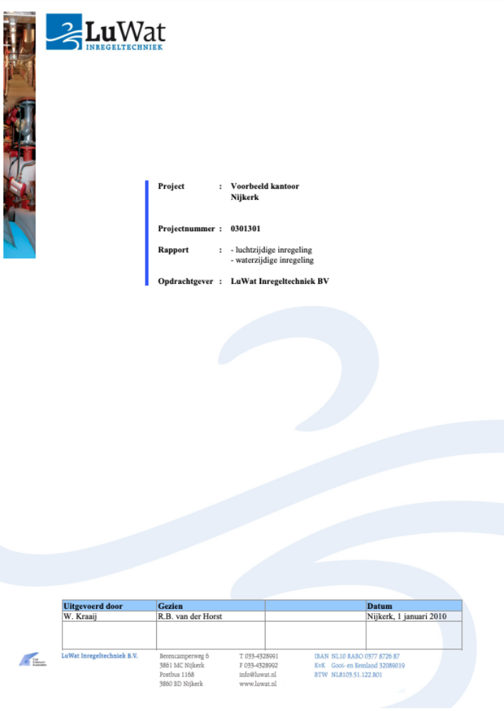 Bij LuWat Inregeltechniek b.v. zorgen we niet alleen voor het inregelen van klimaatinstallaties, maar ook voor gedetailleerde rapportage. Onze metingen en beproevingen worden uitgevoerd volgens de strikte procedures zoals beschreven in ISSO-publicatie 31 (Meetpunten en meetmethoden voor klimaatinstallaties) en ISSO-publicatie 52 (Luchtzijdig inregelen van klimaatinstallaties).